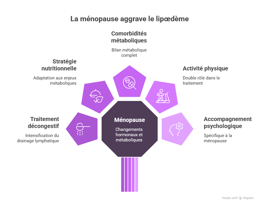 La prise en charge psychologique — thérapie cognitive et comportementale (TCC), accompagnement en groupe de soutien, et si nécessaire traitement médicamenteux des troubles dépressifs ou anxieux — est indissociable de la prise en charge somatique du lipœdème en période ménopausique.